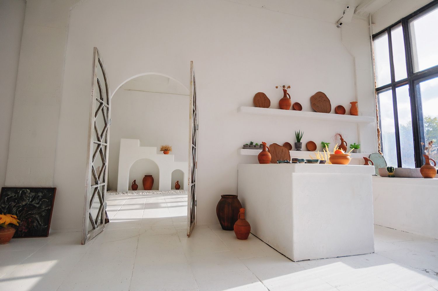 Светлый белый зал с естественным освещением в Африканском стиле, площадью 50 кв.м и вторая часть зала 70 кв.м, которые соединены огромной стеклянной арочной дверью. Солнечная сторона в первой и второй половине дня. Солнечные лучи попадают на фактурную лестницу и зону кухни. Также стена у лестницы и стены душа выполнены с особой фактурой, что придают фотографии объем.