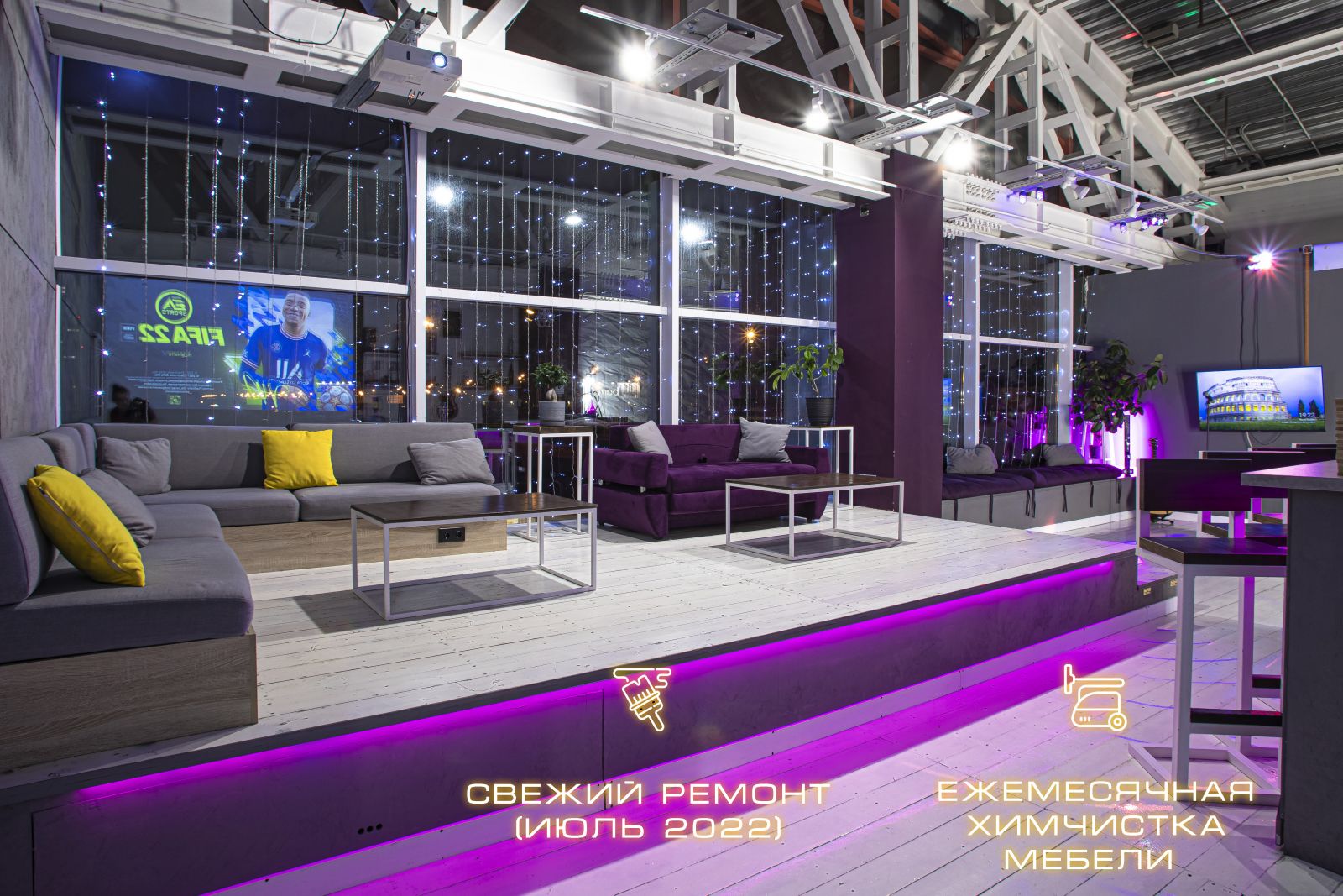 На подиуме располагаются 2 дивана (9 посадочных мест), 2 больших журнальных стола, Sony Playstation 4 с новыми играми на 4 геймпада, и профессиональный проектор качества full hd с диагональю экрана 4 метра.