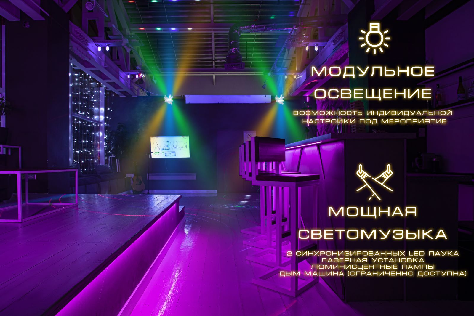 Визуально объединенные зоны. На шикарной плазме 55 дюймов транслируется текст караоке. Звук выводится на мощную колонку Samsung Sound Tower мощностью 750вт, к которой подключены 2 американских микрофона Shure. В зоне танцпола так же установлена светомузыка мощностью 600вт: 2 синхронизированных паука, 1 лазерная установка, 8 источников люминисцентного света, стробоскоп и дыммашина.
