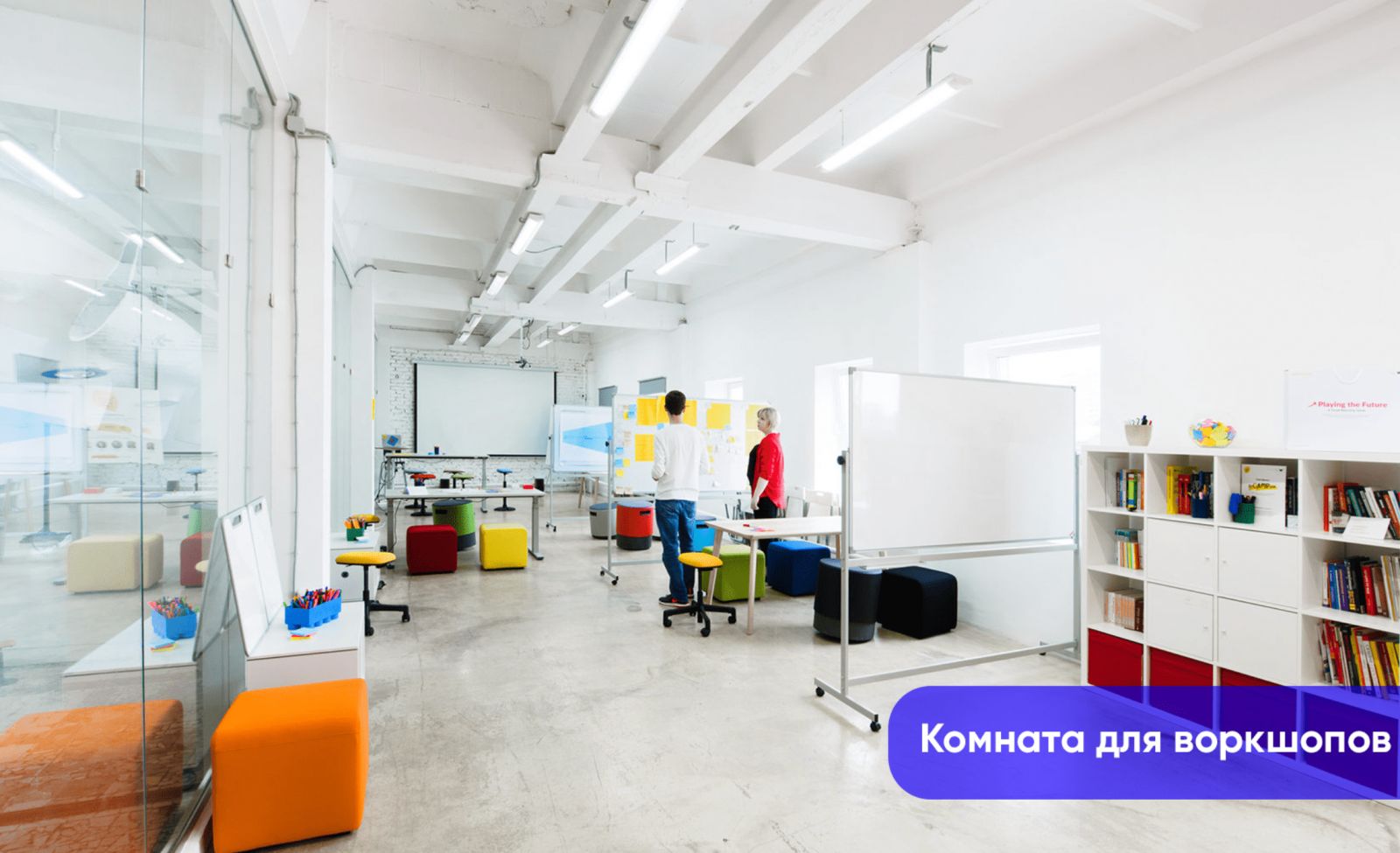 Для проведения мастер-класса или командной работы в небольшой группе из 25 человек подойдет наша творческая мастерская (26 кв.м.) с флипчартами, маркерными досками и рабочими местами.