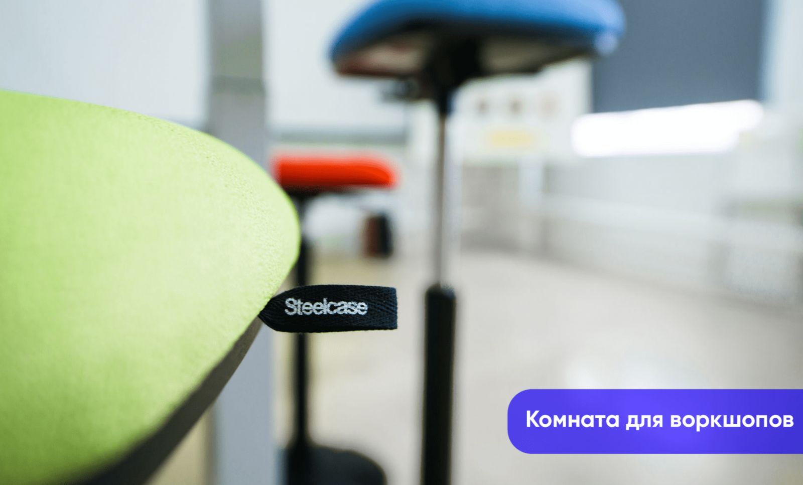 В комнате для воркшопов (75 кв.м.) могут одновременно находиться 40 человек, которые подстроят для своего удобства транформируемую мебель Steelcase.