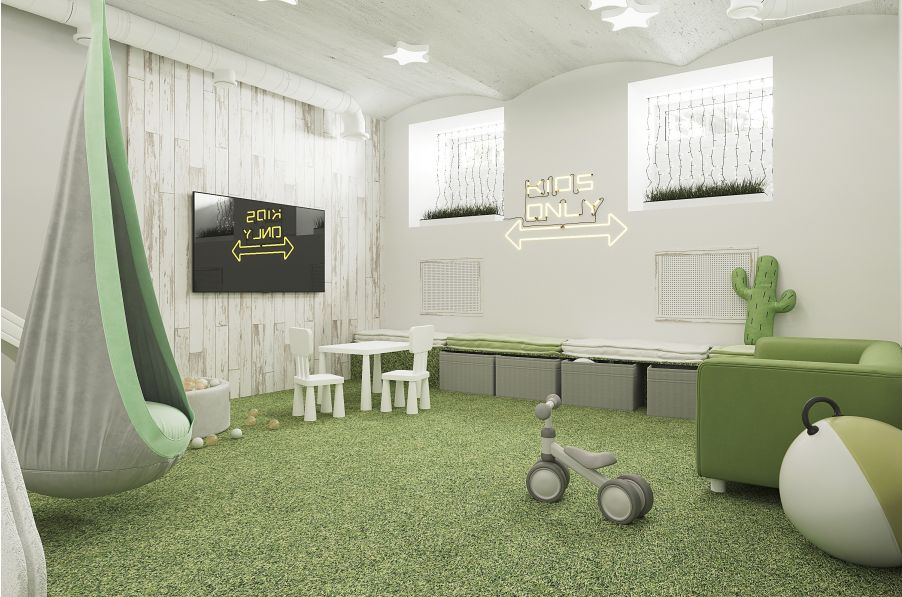 Гостевая зона выполнена в светлых тонах с мягким декоративным теплым светом, детская зона с мягким напольным покрытием выполнена в зеленых оттенках. Вас ждут: Вкусный чай и кофе, free WI-FI, парковка, Обустроенная Детская зона с бассейном из шаров, гамаками, горками, TV (c любыми мультфильмами) и зоной видео-контроля детей (для родителей) Залы Можно арендовать как вместе, так и по отдельности. Ждем Вас в гости!