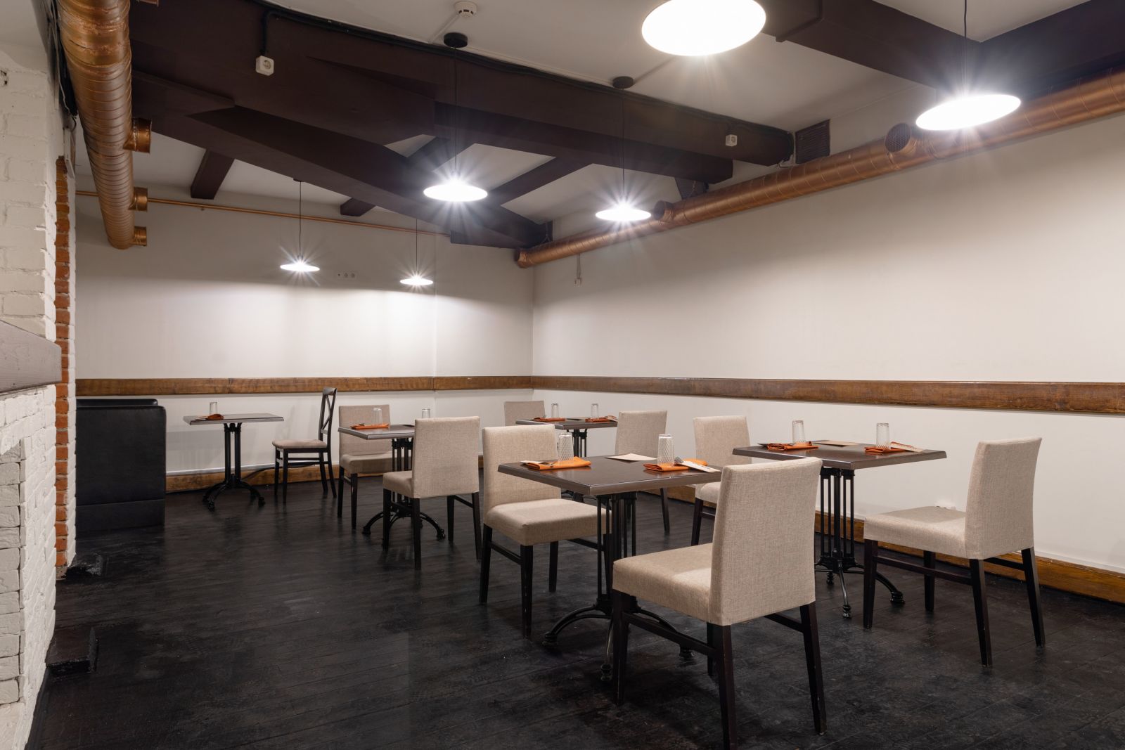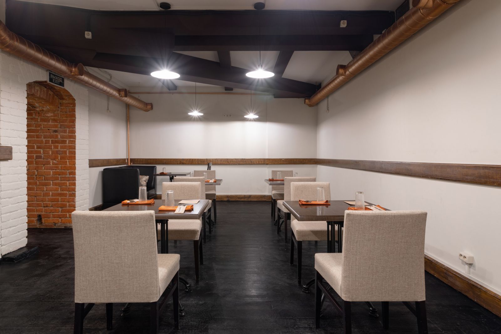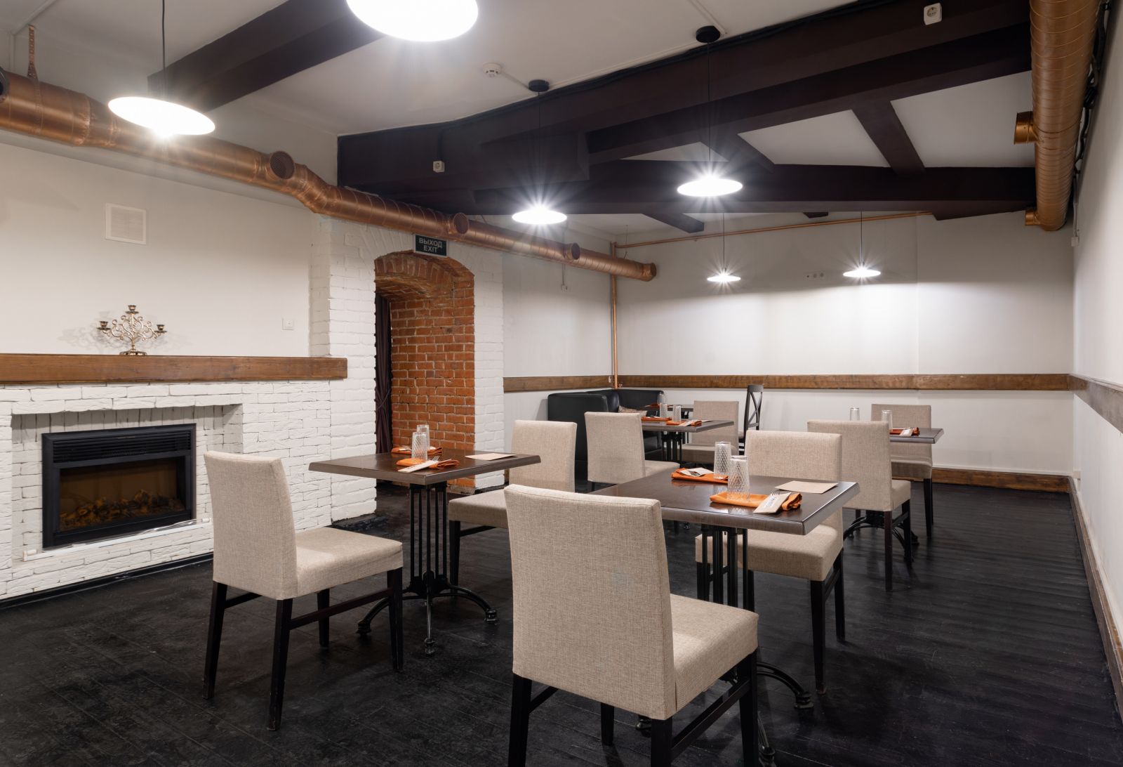 Предлагаем в аренду светлый каминный зал площадью 45 кв м с темно-коричневыми балками на потолке.