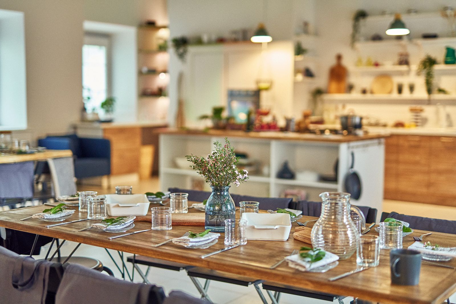 Площадь open space в 103 кв2 удобно зонирована: большой кухонный остров (110х220), техническая кухня, обеденная зона со столом на 8-10 человек (количество посадочных мест может быть увеличено до 16-18, мы привезем дополнительный стол). Каждая из кухонь оборудована плитой, духовкой, холодильником, раковиной и вытяжкой.