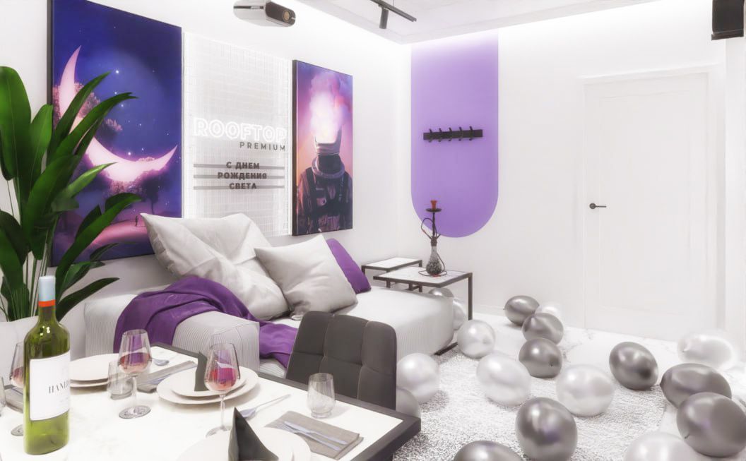 Лофт "Дримлофт» с верандой на крыше - это идеальное место для ценителей минимализма и современного дизайна. Здесь искусно сочетаются неоновая подсветка, стильный однотонный интерьер и зеленые растения, придавая пространству уют и живую красоту. В лофте комфортно могут разместиться до 13 человек.