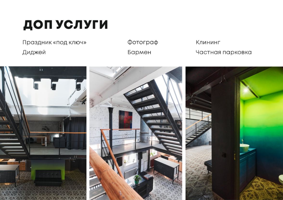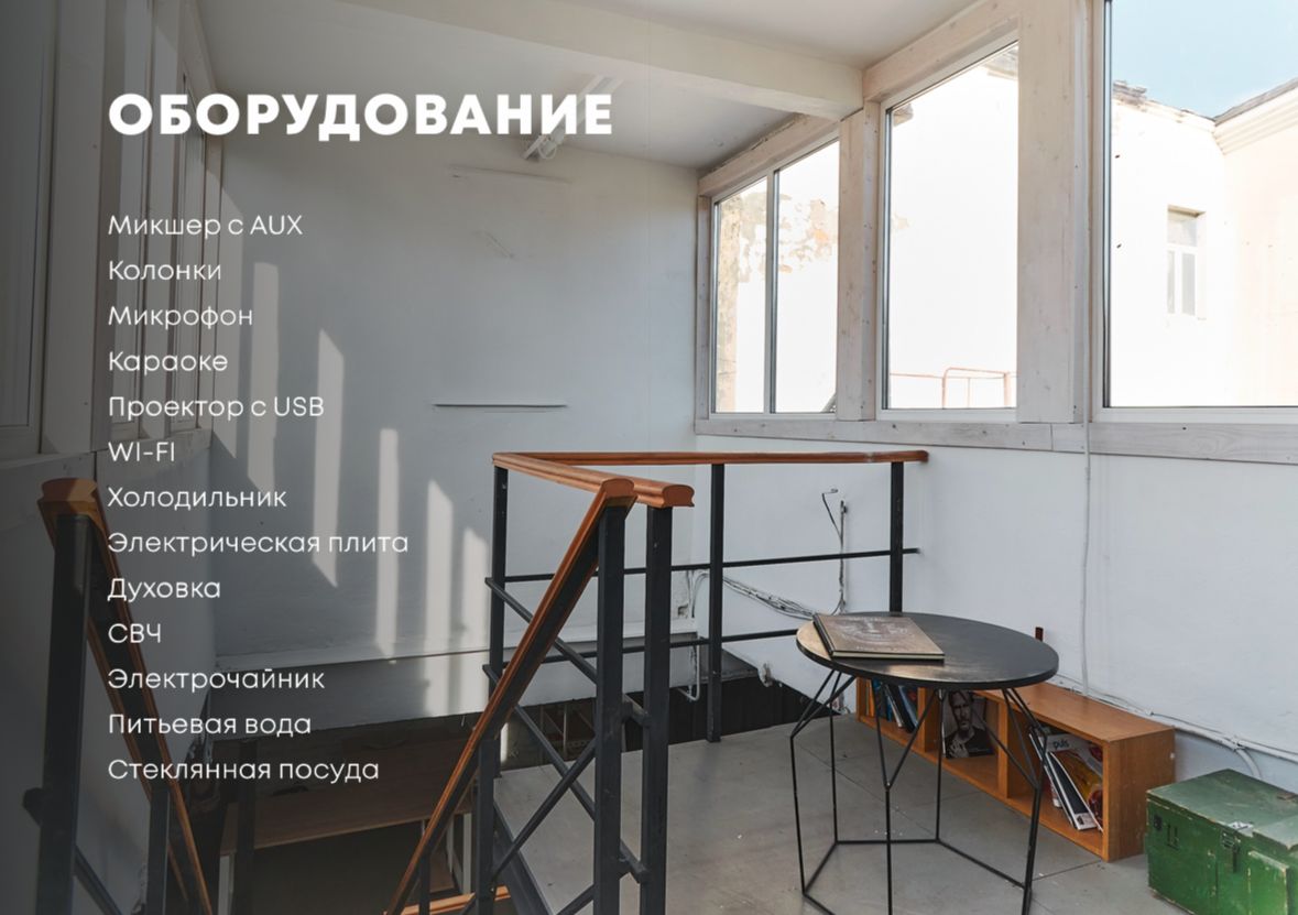 На территории лофта есть полноценная кухня с плитой, духовкой, СВЧ и холодильником. Питьевая вода. Гардероб, уборная и подсобные помещения для вашего удобства. Зона для курения.