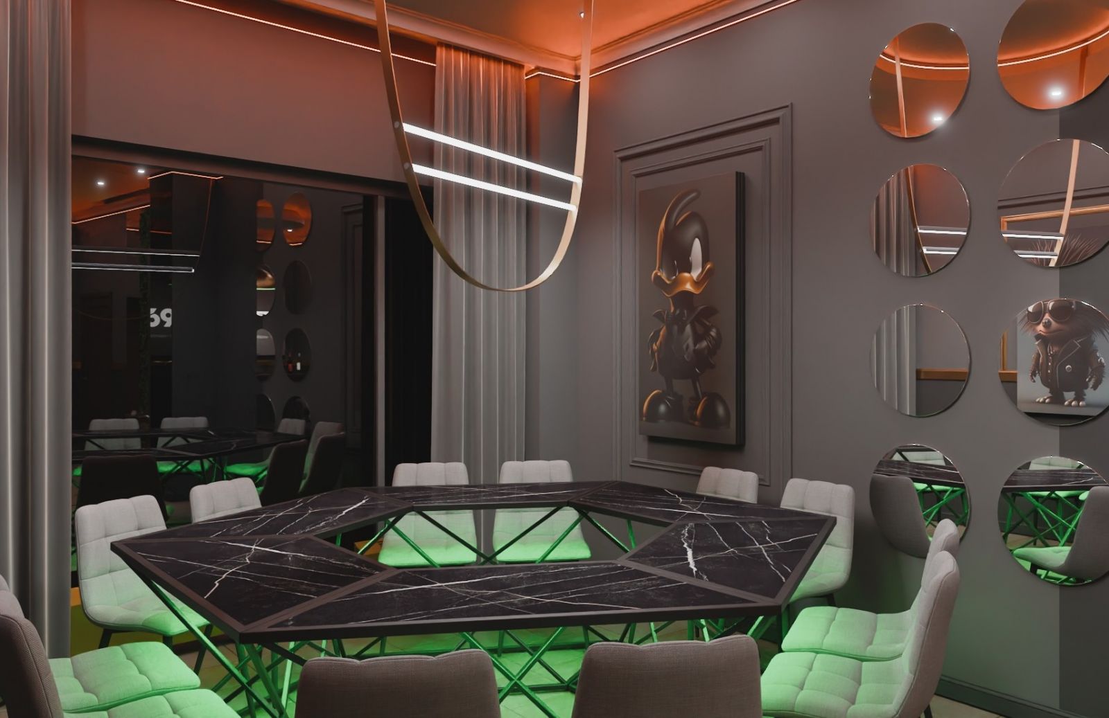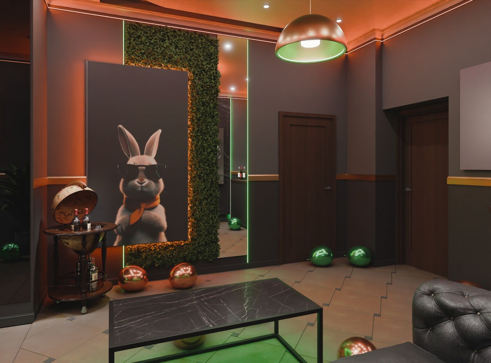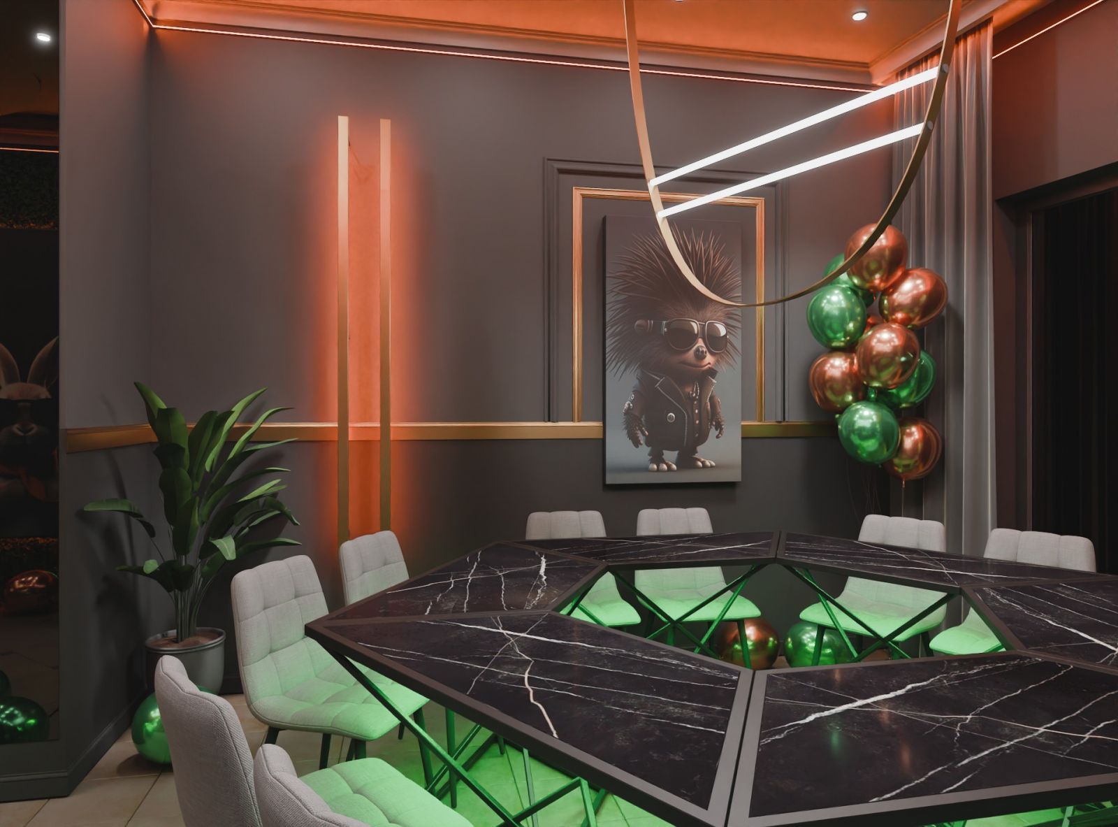 Лофт «Криспи» оформлен в современном стиле, где сочетаются теплые световые акценты и изысканные темные тона. Интерьер украшен модными арт-объектами и дизайнерской мебелью, что создает атмосферу роскоши и комфорта. Пространство идеально подходит для вечеринок, деловых встреч или дня рождения. Лофт рассчитан на удобное размещение компании до 14 человек.