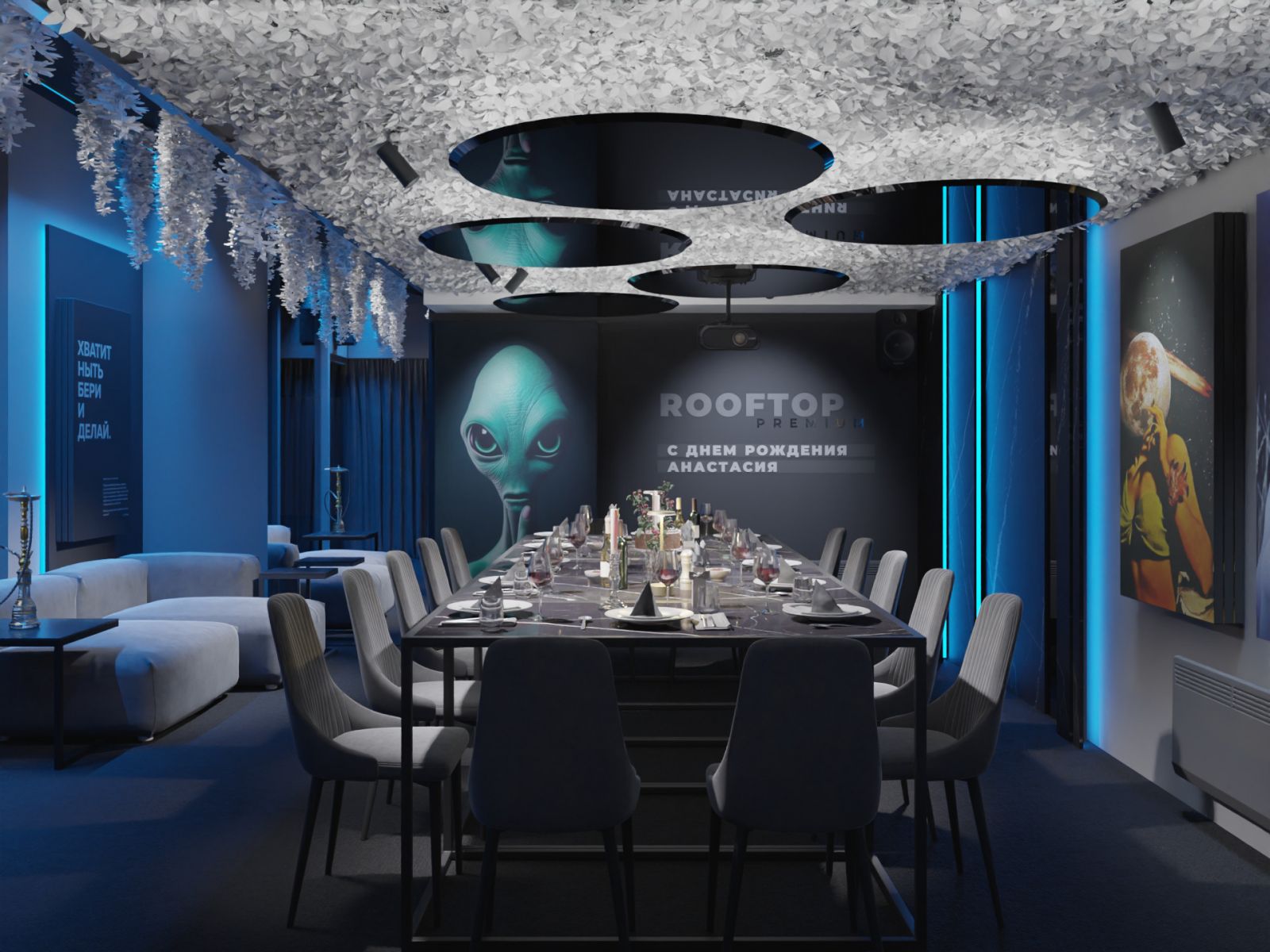 Лофт «Чужой» — это стильное пространство в футуристическом стиле с космической атмосферой и необычными деталями, как на стенах, так и в декоре потолка. Здесь идеально проводить дни рождения, тематические вечеринки и деловые встречи. Лофт рассчитан на компании до 17 человек.