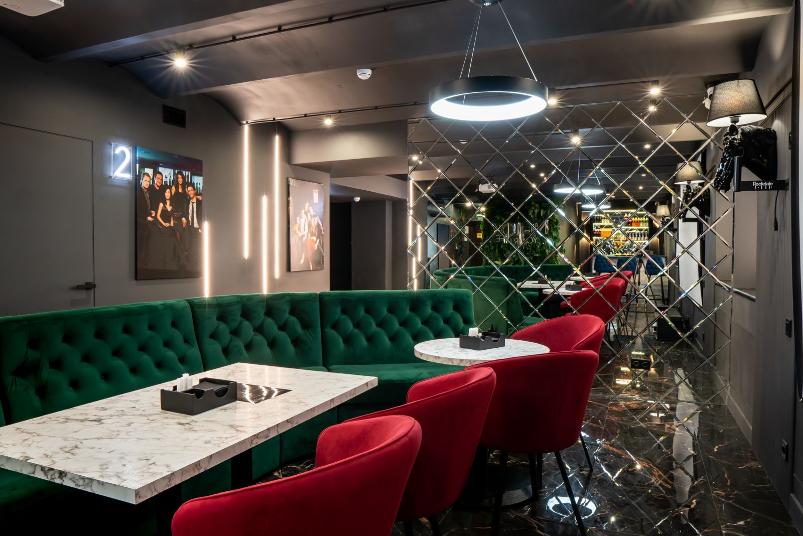 Интерьер общего зала выполнен в графитовых оттенках, что создает уютную и приятную атмосферу, дополнен зелеными зонами. Здесь вы найдете множество удобных мест для отдыха и общения, а также танцевальную площадку, где можно танцевать под любимые музыкальные композиции.