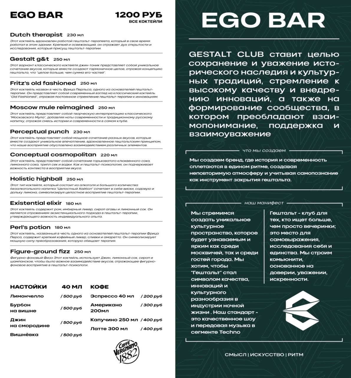 Находясь в историческом особняке, Гештальт сохраняет культурное наследие, придавая ему новую жизнь через современные формы искусства, музыки и психологии. Каждая деталь создана для обогащения внутреннего мира и самоанализа, превращая визит гостя в глубокий персональный опыт. За счет особой атмосферы внутри Гештальта формируется коммьюнити, основанное на доверии, уважении и искренности. В отличие от стандартных клубов, Гаштальт предлагает качественный отдых, включающий в себя возможность самопознания, самореализации, свободы и творчества.