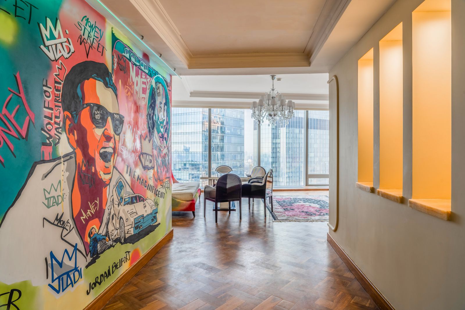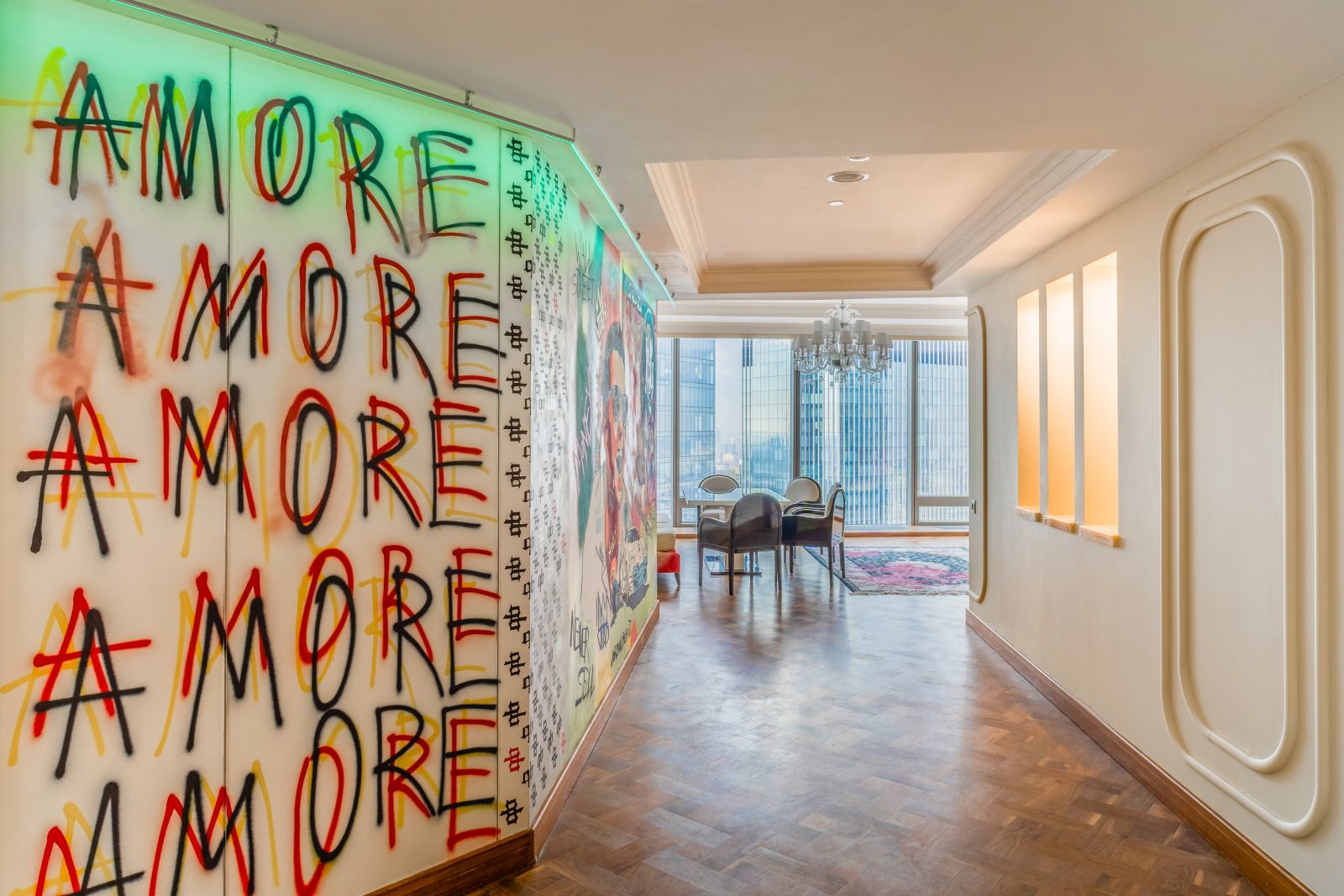 Апартаменты площадью 220м2 расположены на 50 этаже с панорамными окнами с роскошным видом на Кутузовский проспект и Лужники в сторону Запада.
