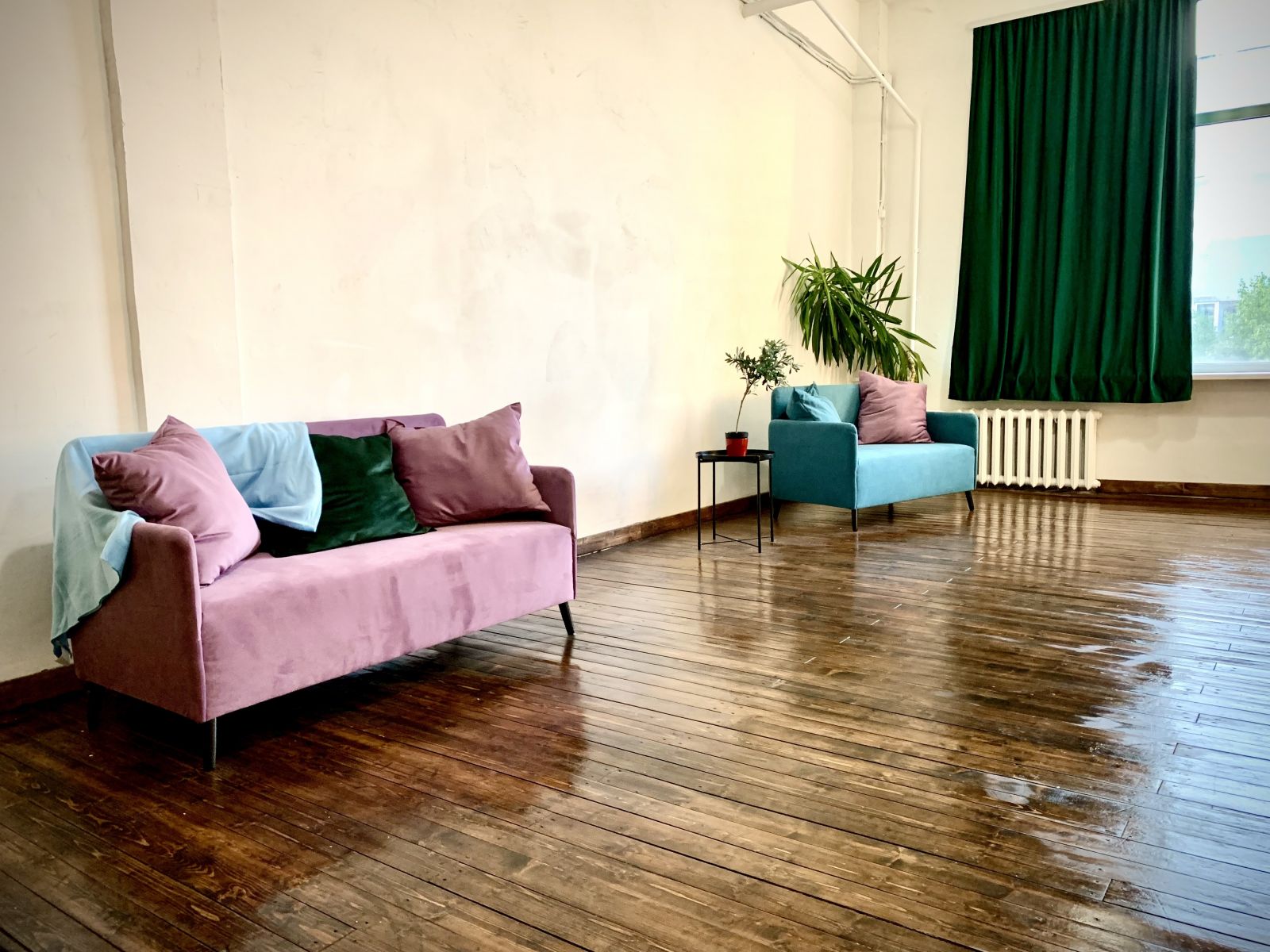 - с деревянным полом, яркими диванчиками, мягкими подушками и большим окном с широким подоконником для посиделок