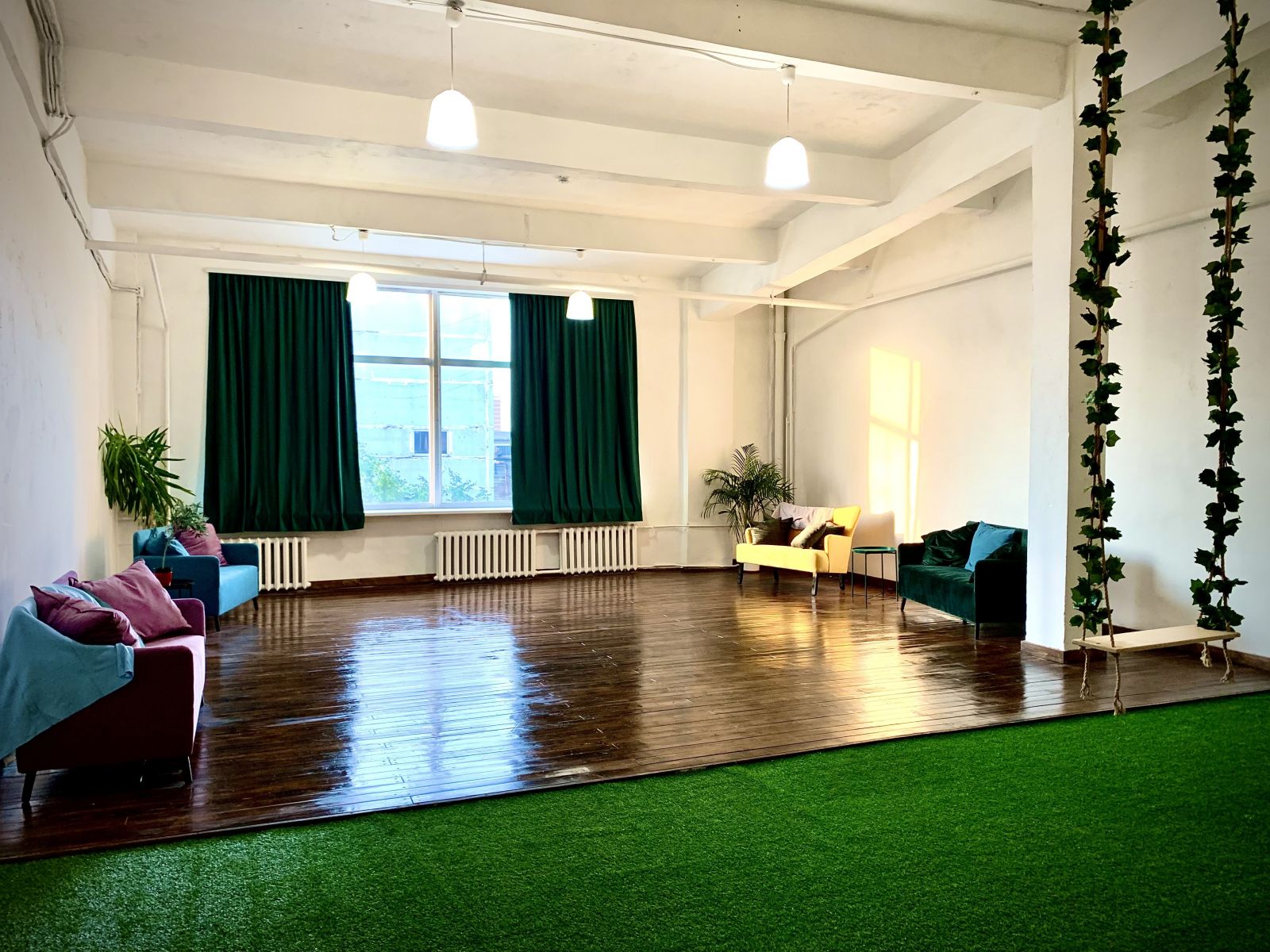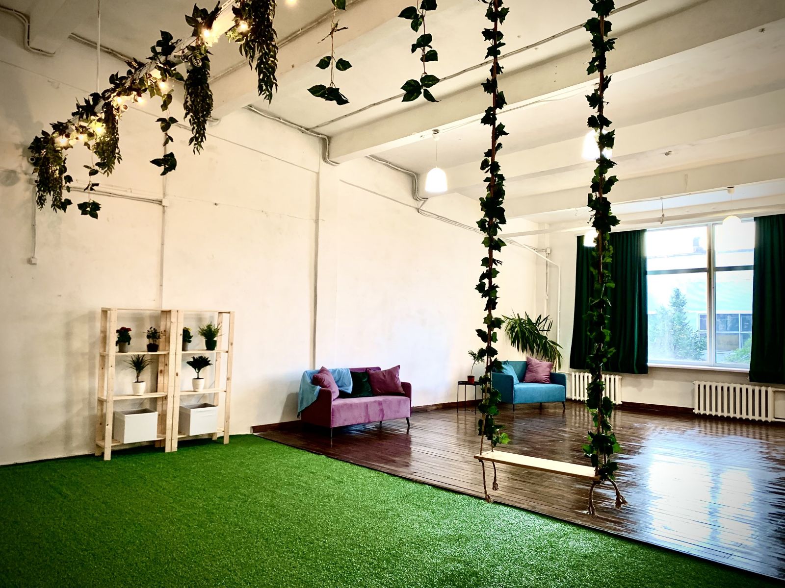 Светлый лофт с яркой мебелью и зоной релакса с газоном и парящими качелями.