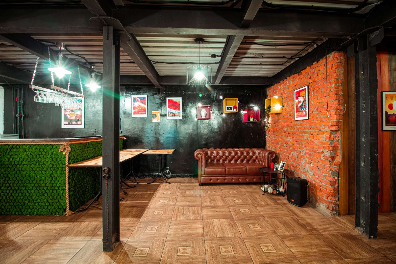 Есть барная стойка, украшенная стабилизированным мхом. На стенах современные картины Nasa и космических путешествий. Диваны комфортные, удобные в стиле честер. Есть фотозона с подвесным гамачком.
