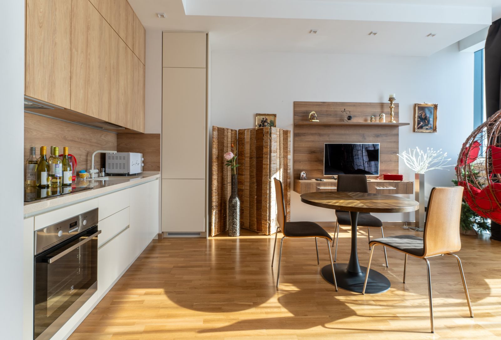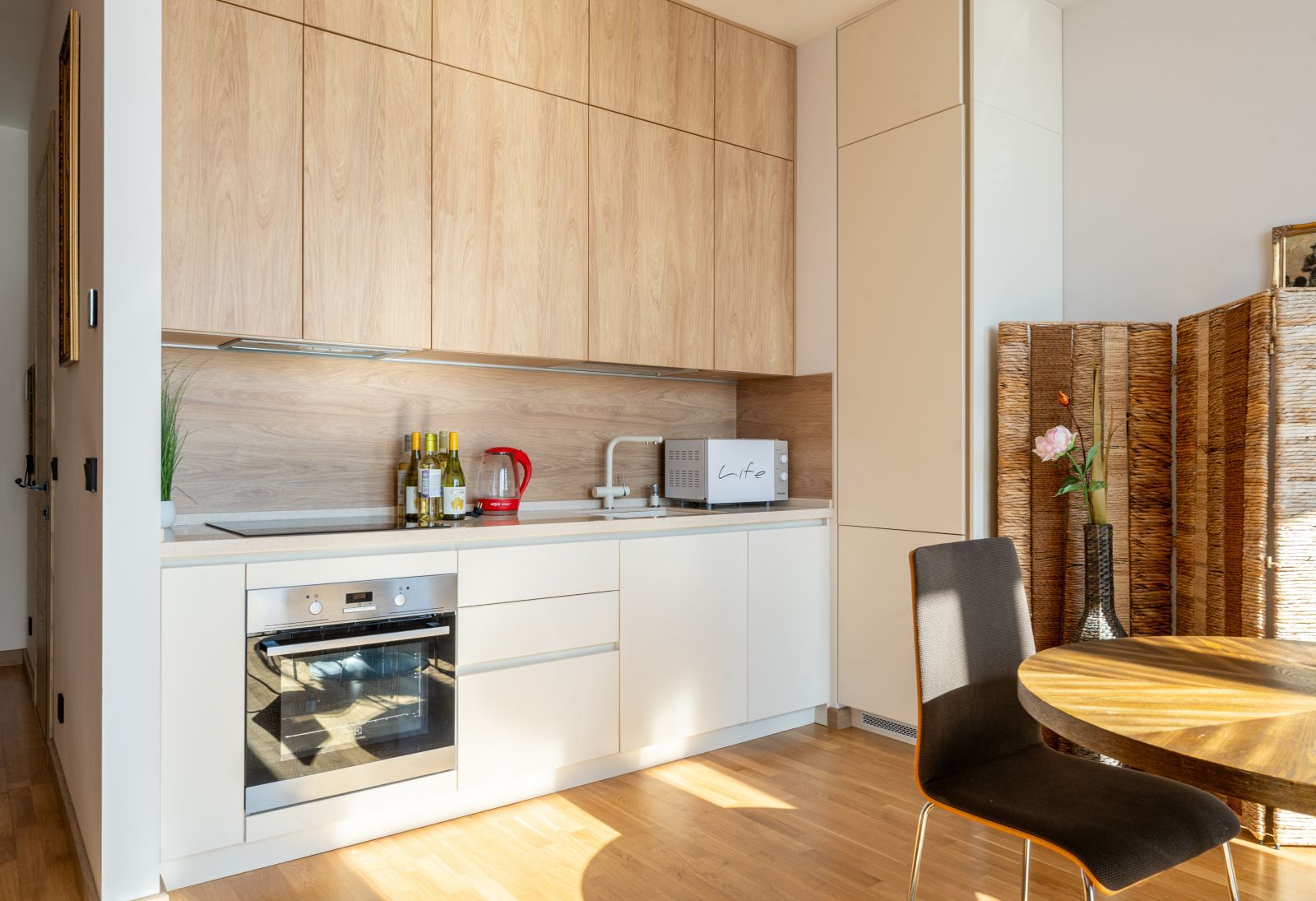 Кухня, оснащенная современной техникой и необходимым кухонным инвентарем, приглашает гостей на романтический ужин под свет свечей. Атмосфера интимности и теплоты располагает к душевной беседе и расслабляющему времяпрепровождению.