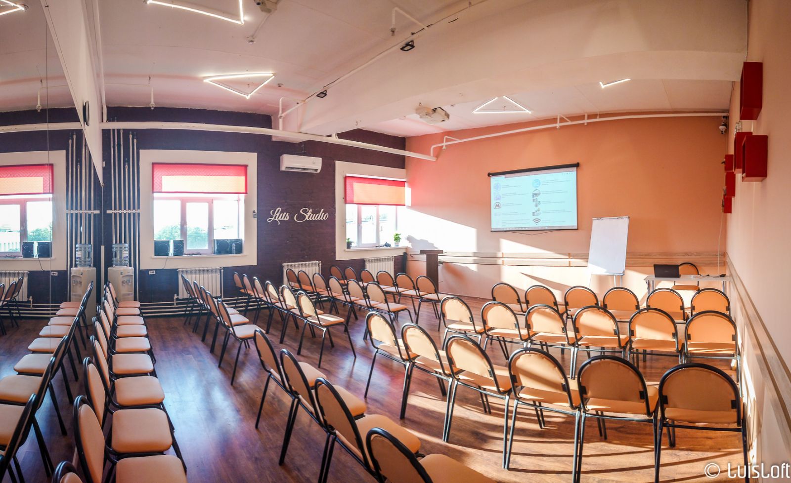 Общая площадь 55 кв.м. Зал предназначен для занятий танцами, йогой, гимнастикой и вокалом, проведения семинаров и тренингов до 55 человек. Напольное покрытие - ламинат. Вдоль одной из сторон располагаются зеркала, которые по запросу могут быть закрыты шторами. Зал оборудован системой кондиционирования воздуха. Зал оснащен всей необходимой музыкальной аппаратурой. Имеется бесплатный Wi-Fi. По запросу в зале можно расстелить ковер. Зал подойдет для занятий групп до 12 человек (танцы или работа на ковриках) или до 55 человек (семинары или конференции, размещение на стульях).