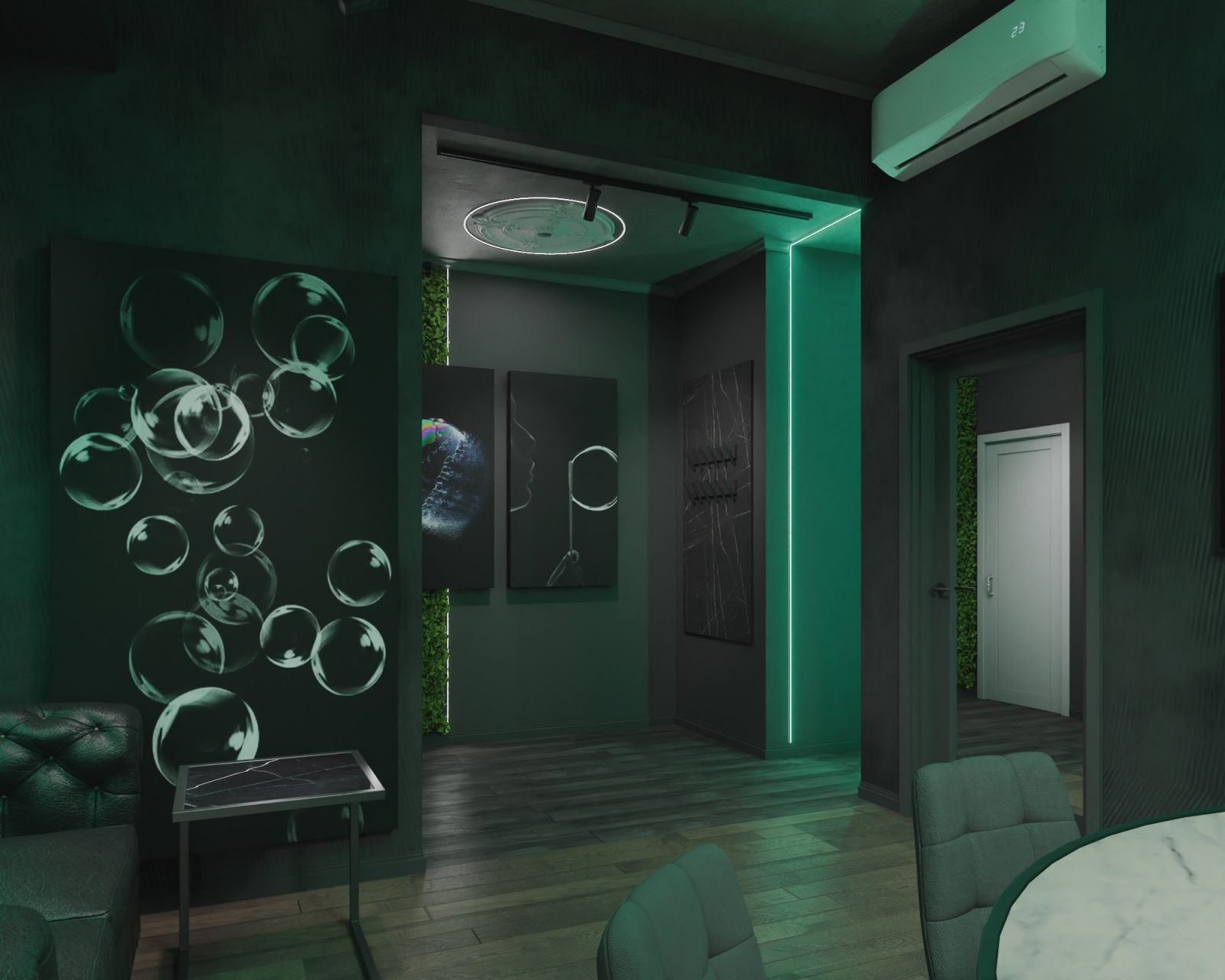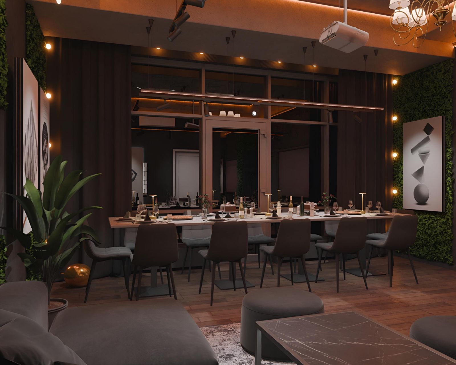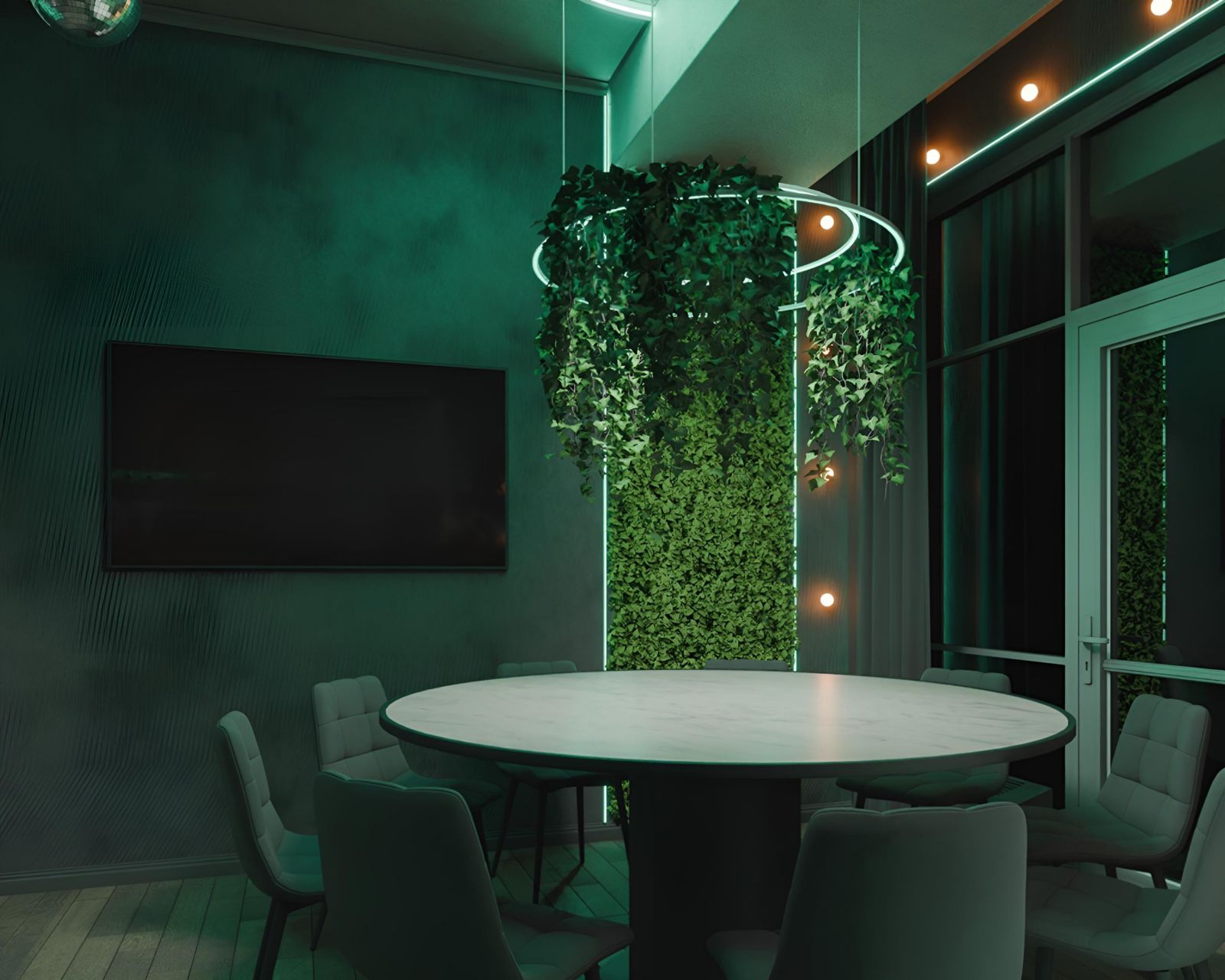 Лофт «Око» — это пространство, где каждый найдет свою атмосферу. В одной зоне, выполненной в темных тонах с зелеными акцентами и мягким освещением, гости могут расслабиться на удобных диванах и насладиться уютом. В другой части — современный обеденный зал с ярким освещением и стильными элементами, идеальный для встреч и торжеств. «Око» объединяет природу, искусство и современный дизайн, создавая уникальное место для разнообразных событий, вмещает до 30 человек.