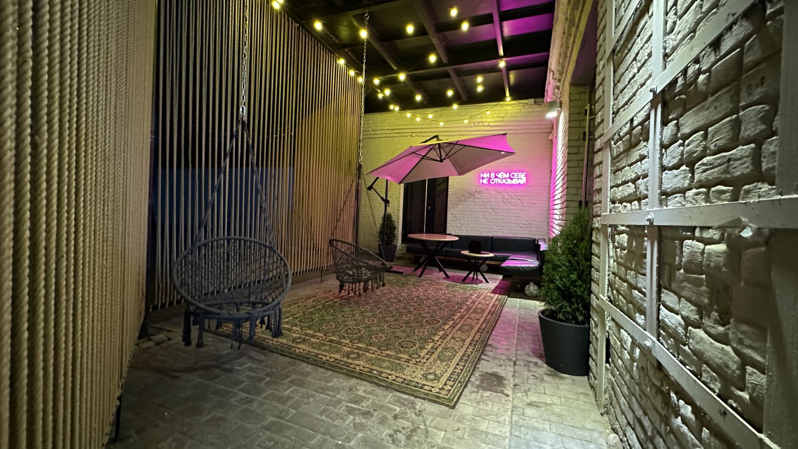 Летом гости отдыхают в одной из зон лофта и на веранде. Для курения выделена специальная зона. В помещении установлены кондиционеры и есть доступ в интернет по Wi-Fi, который входит в стоимость аренды. Конечно, в лофте имеется санузел. А еще здесь есть особая фишка – собственный сад!