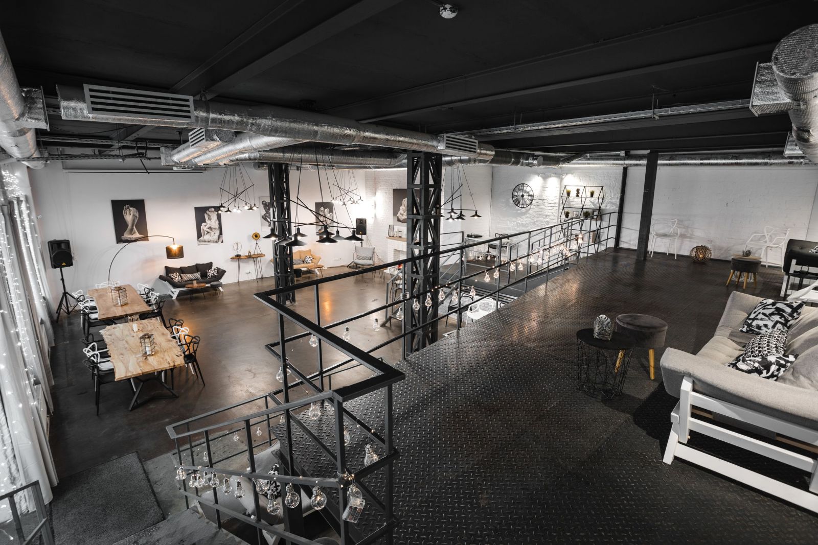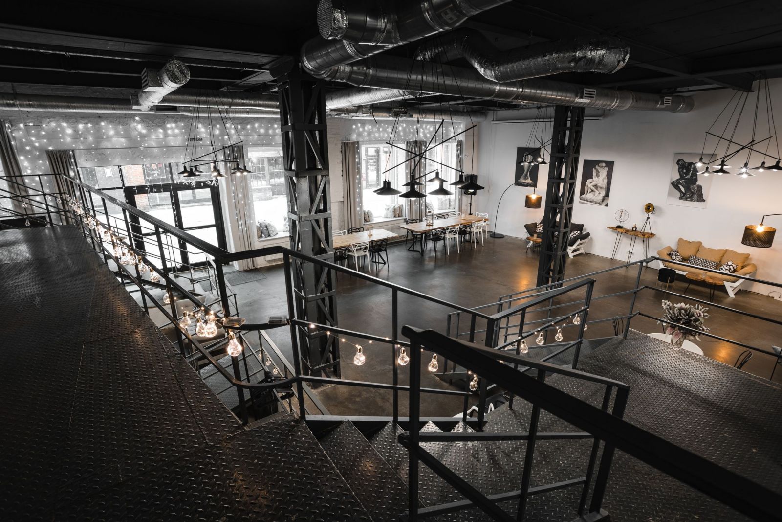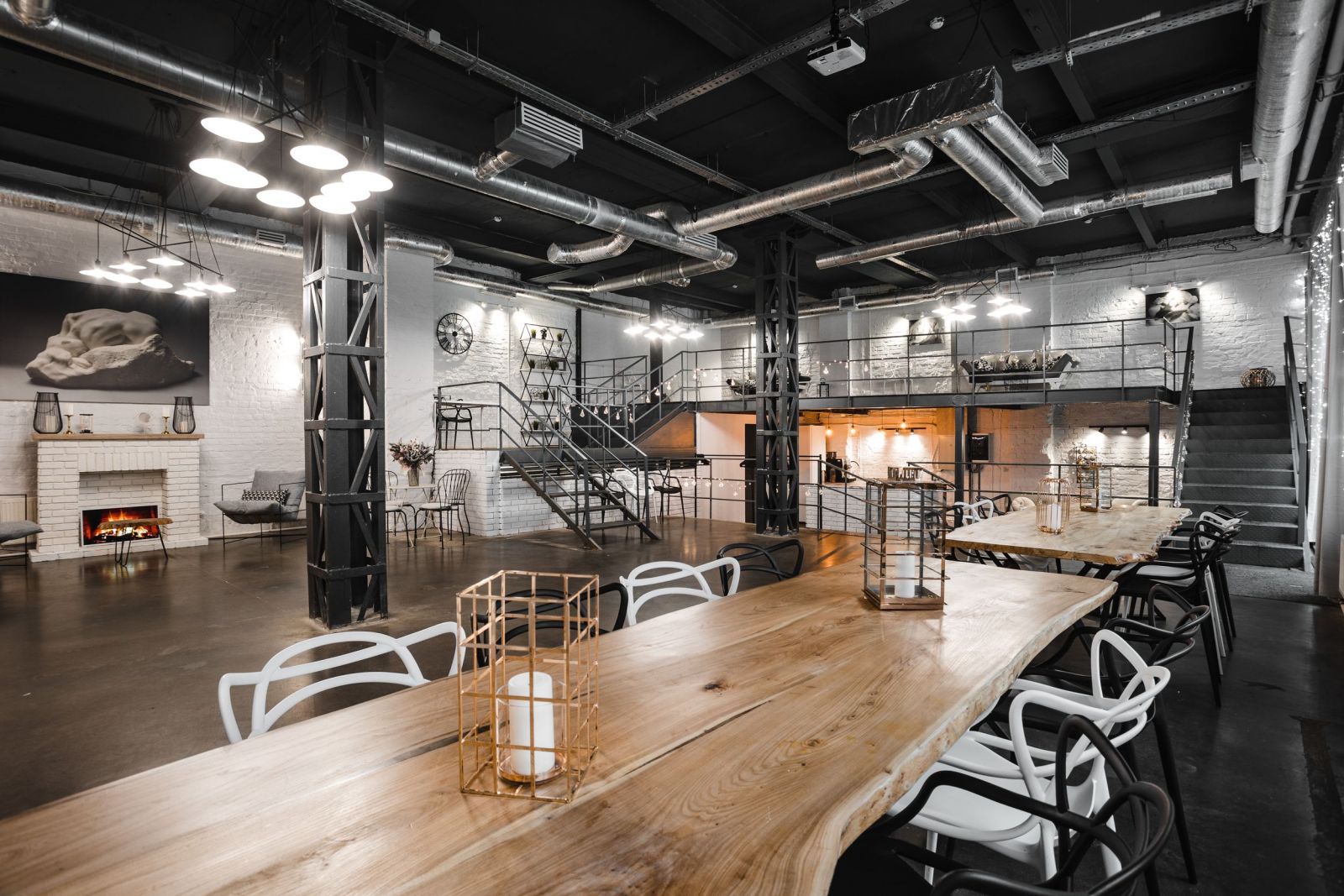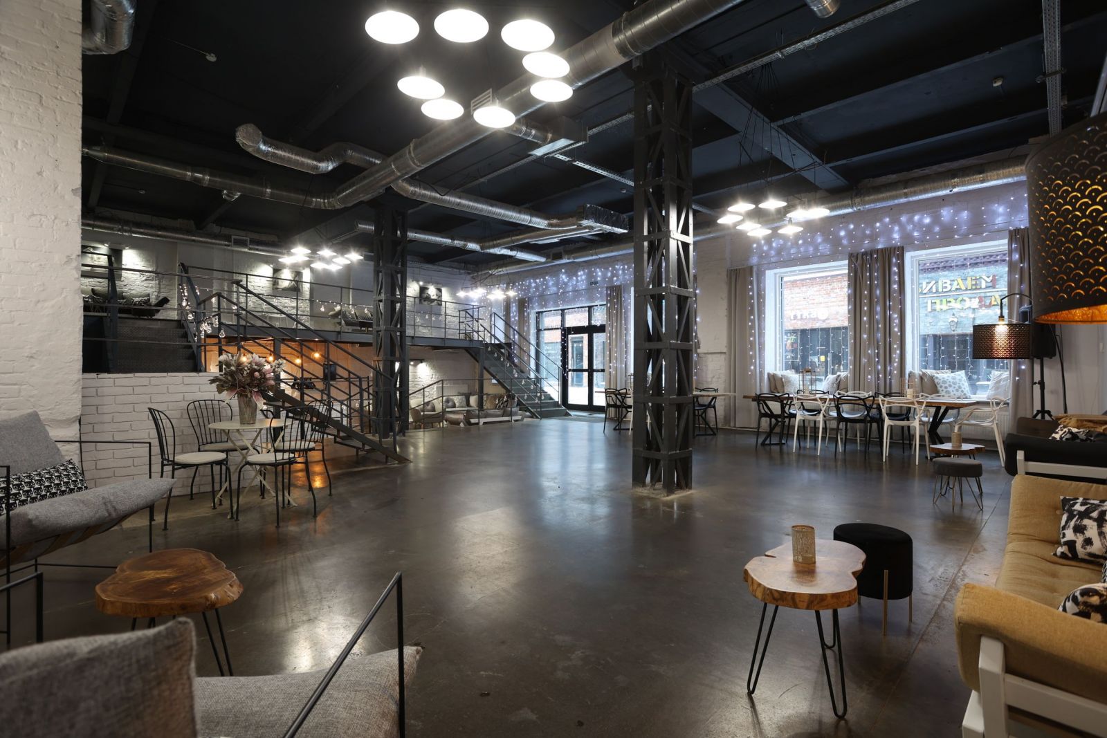 Роден: 190 м², 3 уровня — industrial-зал до 80 участников