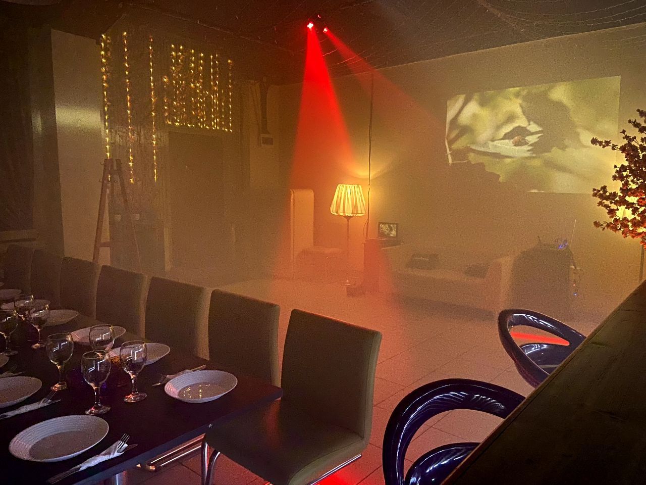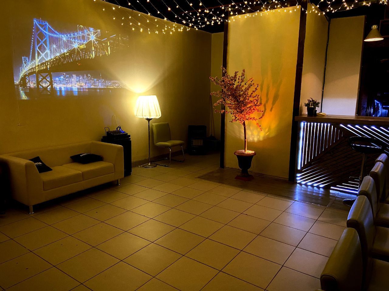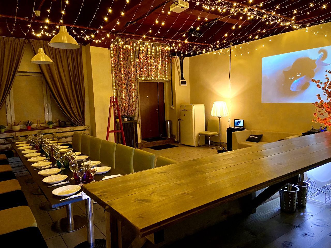Оформление зала в теплых тонах, множество деревянных элементов декора и конечно же теплый ламповый свет переносит вас на "Веранду" загородного дома. Но при всём уюте что царит в лофте , зал оснащен всем необходимым для проведения самой незабываемой вечеринки!