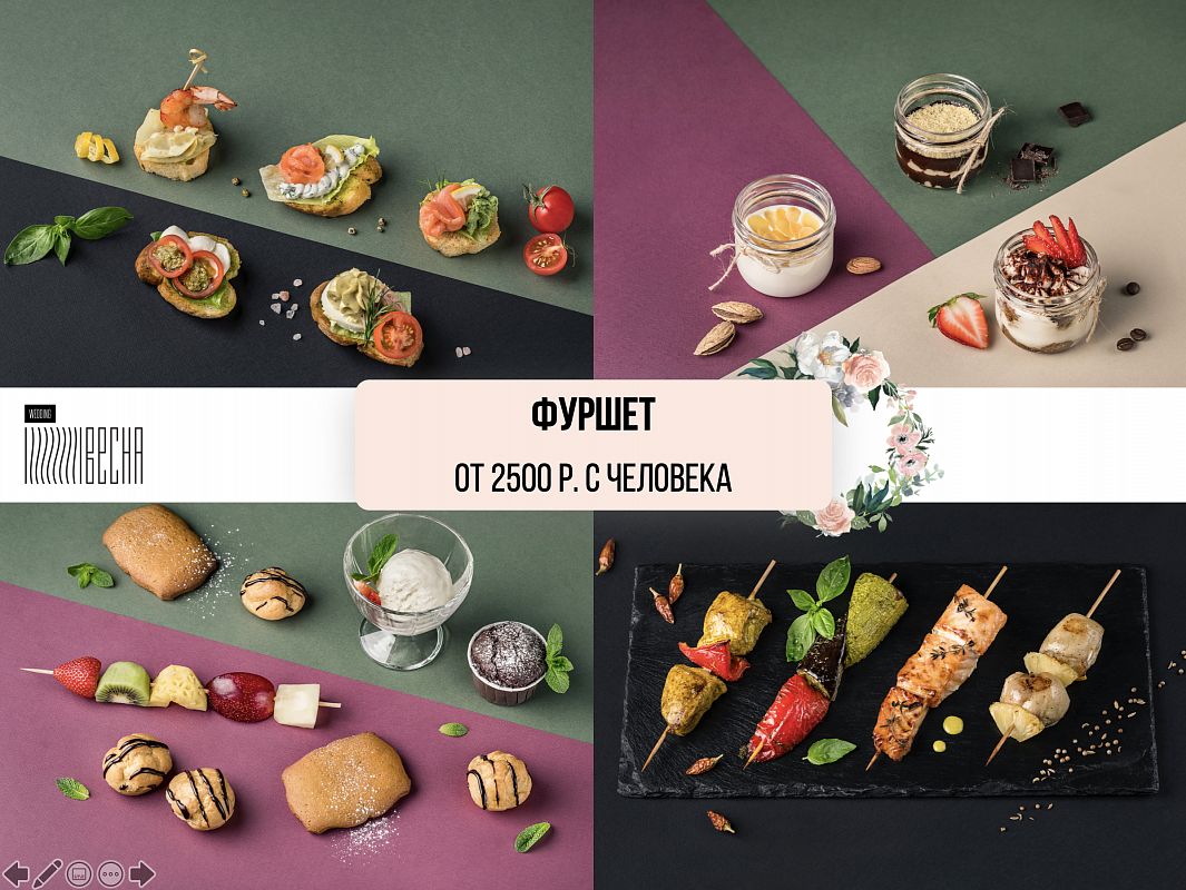 Проект декорирования площадки под свадебный сезон 2019 разработан известной студией на сумму более 1 500 000 рублей, который уже входит в стоимость банкета. Рядом с основным залом расположено еще одно помещение для регистрации площадью 140кв.м. На банкете для вас будет готовить наш шеф-повар, много лет работавший в Европе.